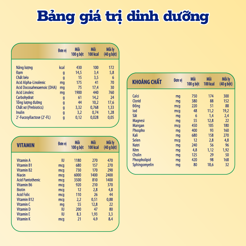 - 👶 Pha 1 ly (230 ml): 4 muỗng (40 g) + 200 ml nước ấm (40 °C); dùng 3 ly/ngày.